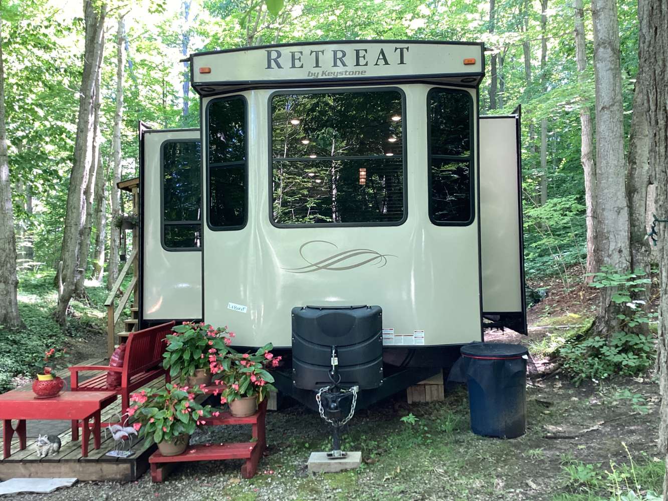 Items Also Included: Roofed raised Deck (8×20) with gates, 10 x 12 screened gazebo with outside patio table & 6 chairs. Also has 0utside shower, central vac & tire covers.